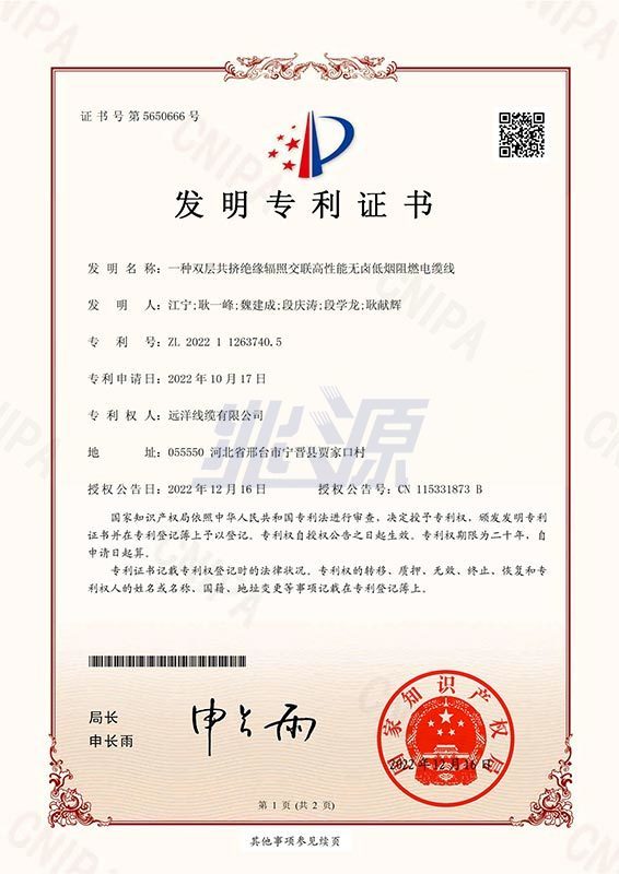 一种光伏风电耐侯新能源电缆.发明专利证书